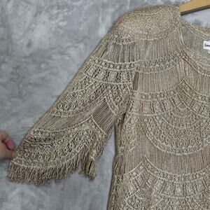 Features a striking metallic gold and beige open-knit crochet pattern throughout. The sweater is semi-sheer and designed with a wide scoop neck and dramatic elbow-length sleeves finished with fringe detail. Scalloped hem and sleeve cuffs add unique styling. Lightweight and airy, perfect as a statement top or elegant coverup.