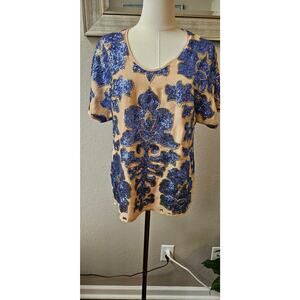 Neiman Marcus Tracy Reese Short Sleeve Sequin Blouse Women Scoop Neck Pullover