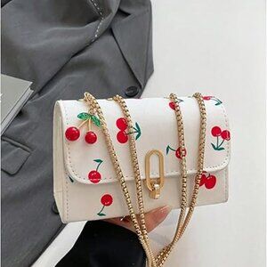 The bag showcases an eye-catching cherry print pattern, complemented by gold-tone hardware and a sleek chain strap that enhances its modern edge. The secure anti-theft buckle closure keeps your belongings safe while maintaining an elegant silhouette.