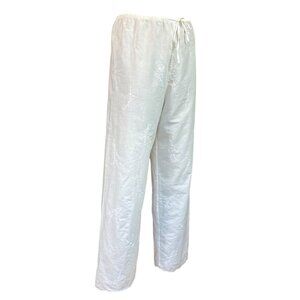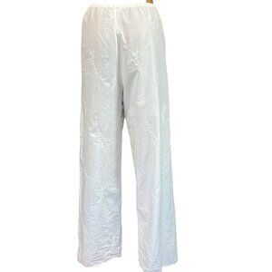 Description: Neiman Marcus White 100% Cotton Embroidered Flowers Pull-On Drawstring Wide Leg Pants Scalloped Hem, Casual, Loungewear.