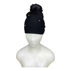 Neiman Marcus Women’s Black Beaded Floral Knit Pom-Pom Beanie Hat One Size NWT