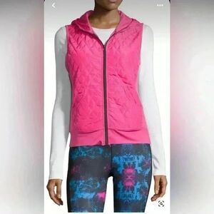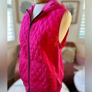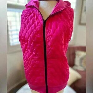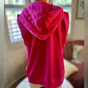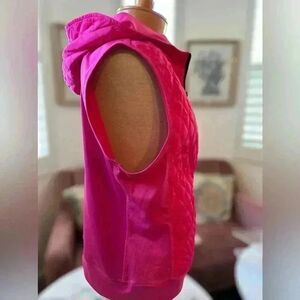 Polyester/spandex. Wonderful fuchsia athleisure vest in like-new condition. This vest features a quilted front with large pockets and thin, stretchy sides and back. Very polished look that can be dressed up or down.