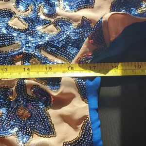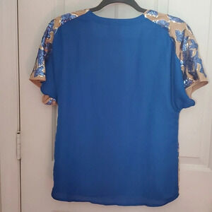Pre Owned - Great condition *there is a tiny hole in the back by the collar where the tag was(see last photo) not noticeable when worn. Beautiful royal blue,gold and tan colors, sheer back, with a high low hem. Machine washable. Great piece versatile wear with jeans or slacks for a more dressy look.
