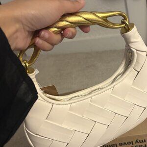 Designed to be worn by hand or crossbody, this woven beauty features an elegant twisted metal top handle, offering a unique contrast of softness and structure. Its versatile form transitions effortlessly from day to night.