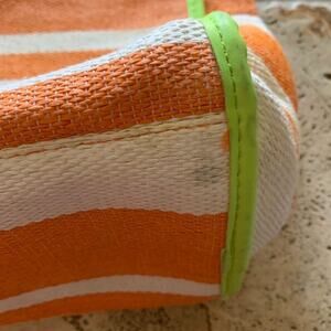 Neiman Marcus tote. Straw like material. Large tote bag. Double straps. Orange & white with green trim. Beach/summer/day trip bag. This handbag/purse is great for spring & summer. Canvas and two arm straps. Look stylish when you hit the beach!