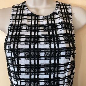 Neiman Marcus black and white cotton dress. This dress features an open weave black and white plaid with high neck and back. Invisible back zipper and fully lined. Beautiful detail on the hem. Like new condition.