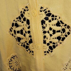 Excellent pre-owned condition. Women's Neiman Marcus lace insert yellow button-up cardigan sweater Size XL.