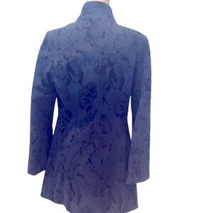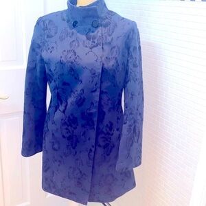 Stunning Neiman Marcus midnight blue/black cotton/ wool/rayon jacket with ๐ฏ silk black pants. Jacket has black embossed velvet pattern through fabric. Two button closure at funnel neck and hidden snaps down front. Bell sleeves.Lined.Size Medium.
