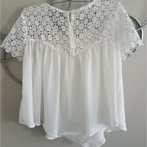 Cute excellent preowned designer top purchased at Neiman Marcus. Lace on top, cool assymetrical layered hem. Pretty cream color.