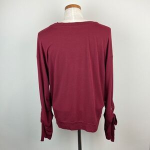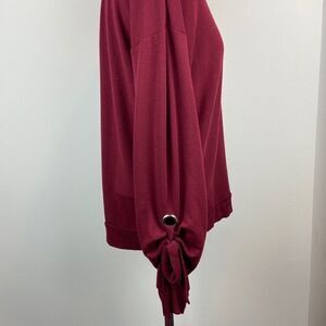 This sweater is in excellent condition. Featured with a tie at the cuff of each sleeve and maroon in color. Material is extremely comfortable and stretchy - made from viscose, polyester, and spandex. Size medium. Please send any offers or questions!