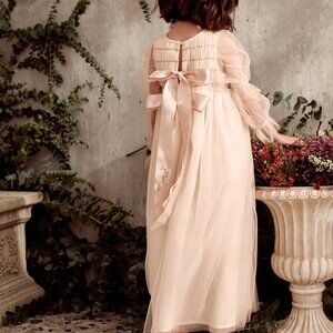 A puffed sleeve, maxi tulle dress made dreamy with pretty details like metallic thread embroidery, smocking, glitter buttons, and double grosgrain ribbons at the back, the Isabella is ready for any special day: flower girl days, birthdays, Christmas, Easter, Eid, or the milestone first communion.