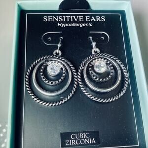 antique silver color plated crystal triple row circle with cz drop earrings. Brand new in original box. Designed for sensitive ears.