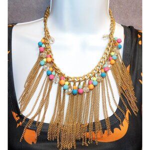 Neon 80s Beaded Gold Tone Chain Fringe Necklace