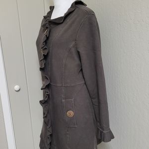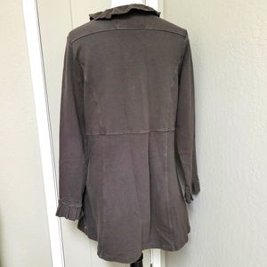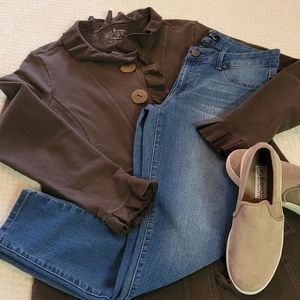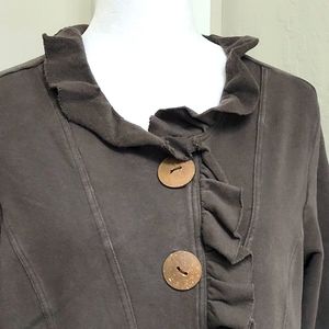 Known for their quality clothing, this jacket is comfortable with a longer flattering fit. Mostly cotton with just enough spandex for stretch and comfort. Heavy enough for early spring weather.