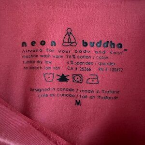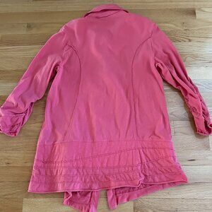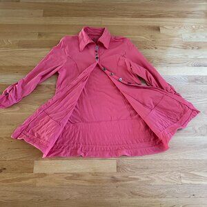 Neon Buddha Eastwood Novelty-Button Top. Salmon color. Button down with buttons on both sides for double the buttons. Different shapes and sizes of the buttons. Collar. Decorative edges and seaming details. Puckered 3/4 length sleeves. Longer silhouette. Could also be worn as a light jacket. Excellent pre-owned condition. No known flaws. No holes, stains or snags. 96% cotton, 4% spandex. Size M.