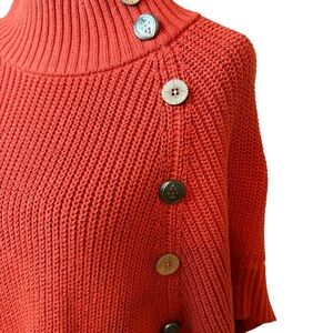 Vibrant orange poncho with button details. Features front pockets. Perfect for layering.