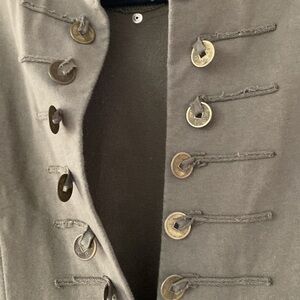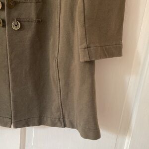 Preloved but excellent condition. Features two pockets, coin embellishments, one hook and eye closure, neutral color. Sage green color is a khaki / gray green that is more neutral than army green. Beautiful jacket ready for the season! It’s stretchy and cozy, not too thick!