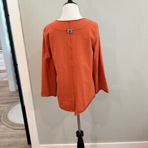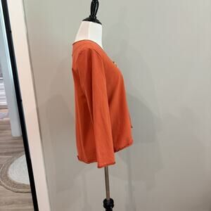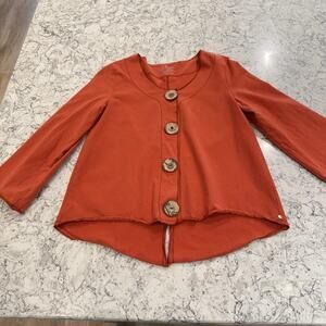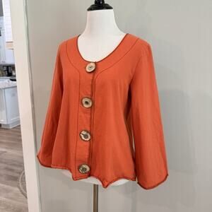 The Neon Buddha top is a small size, orange button-up knit top that features a solid pattern and long sleeves. Bold and unique wood chip buttons (yes, real wood!).