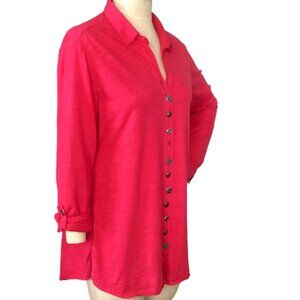 The Neon Buddha Women's Stepping Out Shirt Sweater in size L is a stylish and versatile top perfect for travel, casual outings, or business meetings. This pink rhubarb sweater features a solid pattern, long sleeves with roll tab detail, a collared neckline, and a button closure. Made of 100% cotton, it offers a relaxed fit and is machine washable. The decorative bronze buttons add a unique touch to this tunic-style sweater, making it a fashionable choice for any season. Perfect for those who love a coastal grandma, colorful, bohemian, or Barbiecore look.