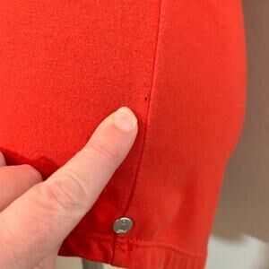 Neon Buddha orange cowl neck top. Sleeves roll up with button tabs. Cowl neck. Rounded hemline. Size XS. Good preowned condition. One tiny hole from tag on side seam at bottom. And one small water spot as shown - hardly noticeable. 95% cotton 5% spandex. Machine wash.
