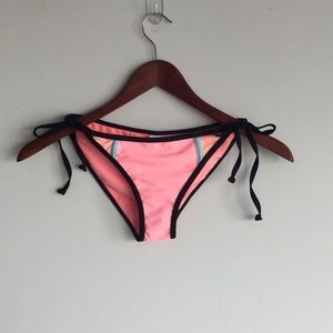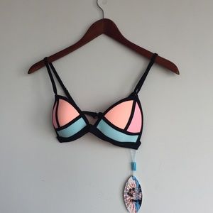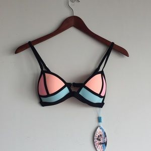 Neon colorblock bikini by Bingo Surf. Padded push-up triangle top. Adjustable straps and silver hook back closure. (See last picture for size chart.)