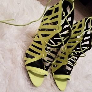 These neon yellow heels will add a pop of color to any outfit! They feature a cut out design along the sides and a lace up detail at the front. The heel is 3-4 inches. They fit true to size.