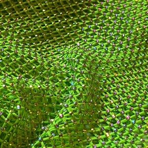 Vibrant neon green mesh top with long sleeves. Sparkly rhinestone embellishments. Sheer polyester stretch mesh fits S-Xl. Perfect for your next festival, party or rave outfit
