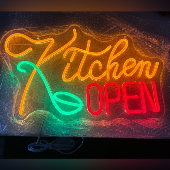 Bright neon sign with 'Kitchen Open' text. Features vibrant orange, green, and red colors. Perfect for adding a pop of color to your space.
