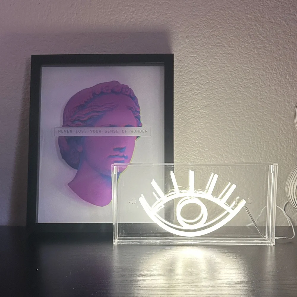 Illuminate your space with a striking white neon eye light. Perfect for adding a touch of modern art to your home.