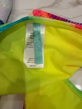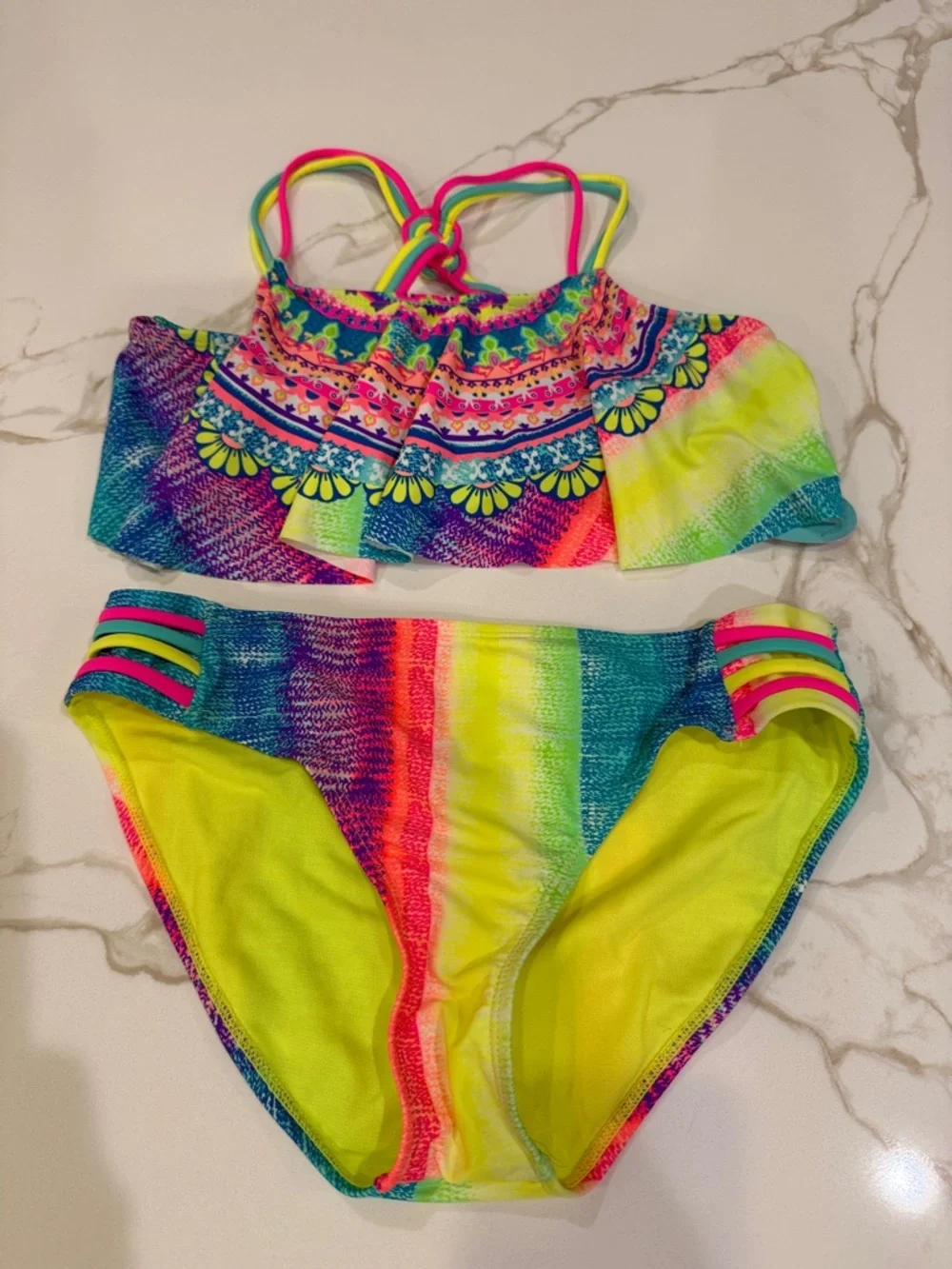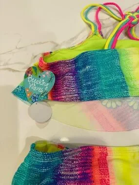 Breaking Waves Vibrant striped bikini with ruffle bandeau top. Bright neon colors with floral trim detail. Matching bikini bottoms with multi-strap sides. Fun, colorful swim set perfect for summer.