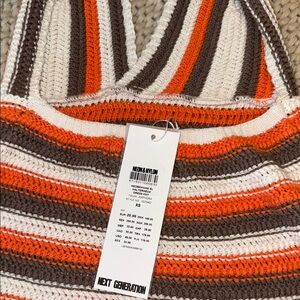 Stylish crochet mini dress with orange, brown, and white stripes. Features a halter neckline. Would be a super cute bathing suit cover up! New with tags!
