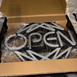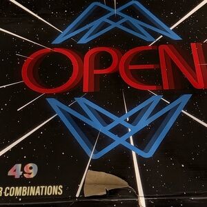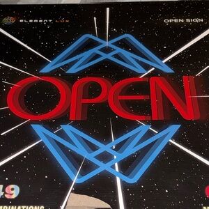 Vibrant neon open sign with remote control. Features blue and purple colors.