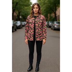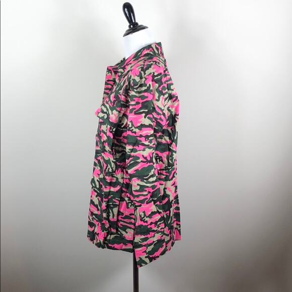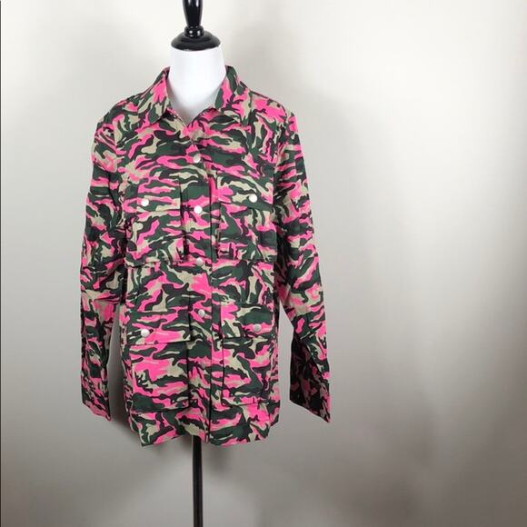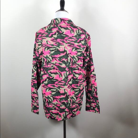 Neon pink camo button front camp jacket. Four front pockets. Snap front closure. 100% cotton.