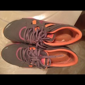 Super cute neon shoes! I wore them to Zumba in but never actually out just at the gym. There is a slight lift on the toe of the shoe (pictured) could probably be secured with a dab of glue.