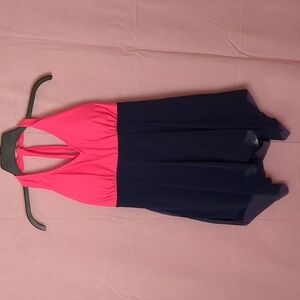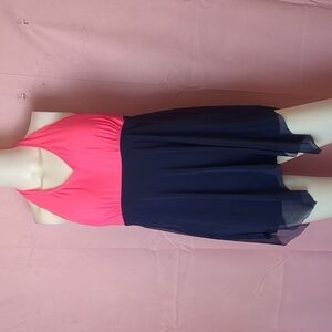 Neon Pink and Blue V Neck One Piece Swimsuit with Sheer Skirt Overlay size Large