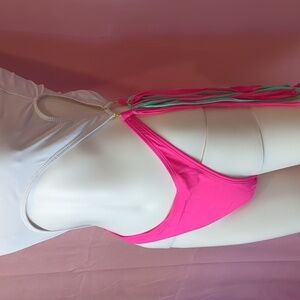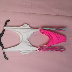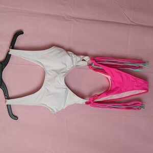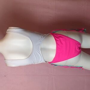 Neon Pink and White Cut Out Monokini Fringe Sides One Piece Swimsuit size Large