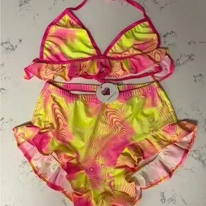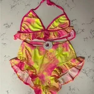Vibrant neon bikini with ruffle details. Eye-catching design. Perfect for summer fun.