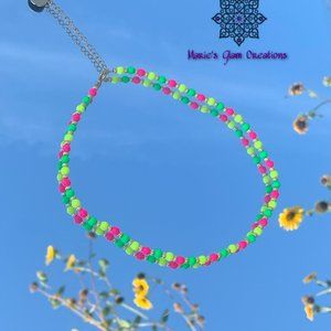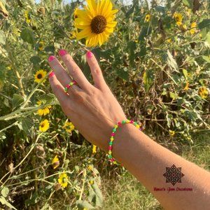 This necklace, bracelet and ring set is made with a neon color combination of Swarovski pearls.The charm material, end clasp and extension chain of the necklace is Stainless Steel in gold color.The bracelet and ring shown in the photos measure 18.5 and 5.4 (ring size 7) centimeters respectively and they are elastic.They are connected with a fine gold stainless steel chain.The necklace measures 33 cm and has a chain extension that measures 5 cm additionally.If you have any questions, contact me.