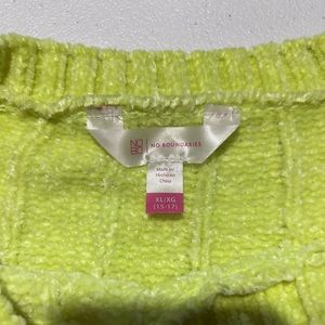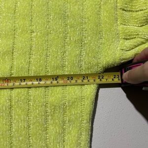 Very soft fuzzy material. Neon yellow in color. Scoop neck. Pretty worn. Even some pulling in the fabric/seams (shown in pics). Is a tight fitting sweater if you get your true size. I wore it slightly oversized. Measurements are laying flat pit to pit and length.