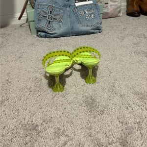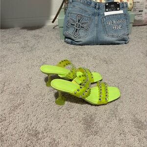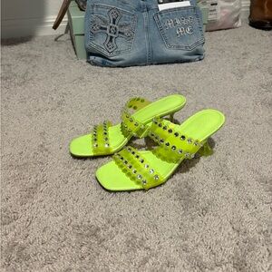 Vibrant neon yellow sandals adorned with sparkling rhinestones. Perfect for adding a pop of color to any outfit.