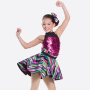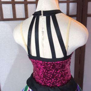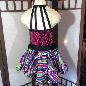 Vibrant and sparkly dance costume. Vivid colors of green, pink, purple and white with black trim. The skirt is fairly stiff and the top has sequins with four black straps in the back.