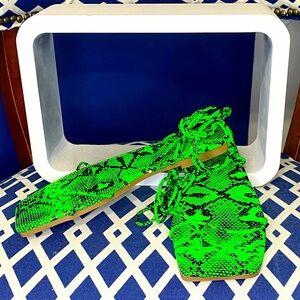 Neon green black snake strappy square toe flat wrap around sandals sz 10(EU 42) bright slide sandals