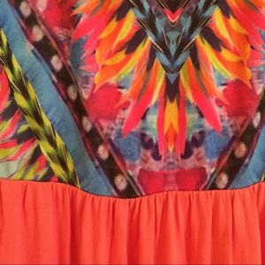 Sleeveless neon maxi. Coral colored on bottom. Scoop neckline and gathered elastic waistline. Unlined. Length: 59", Bust: 38", Waist: 34", Hips: 46"