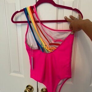 Hot pink with "one shoulder" rainbow straps! Size small and super cute but torso runs long.