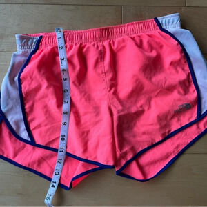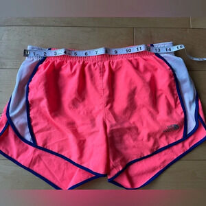 Neon pink North Face athletic running shorts with blue white trim, size small S