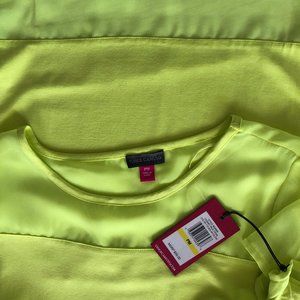 VC neon lemon tunic with sheer panels and interior ribbon hangers. Wide scoop neck pullover tunic style, loose fit, size PM, measured flat fits 38" bust, 34" waist and 38" hips. The hi-lo hem is 26" in front/29" in back. Cosmic Pale color " Solar Glow" on tag NWT, retail $59. Knit fabric is stretchy viscose/elastane, the sheer panels at neckline, short sleeves and bottom hem are poly not stretchy. Cool color for Spring/Summer!