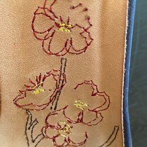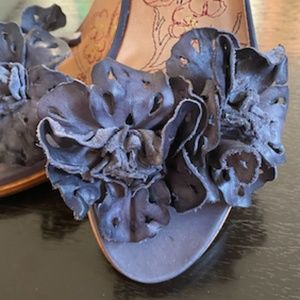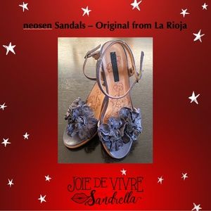 These romantic Neosen Sandals - Original Shoes from La Rioja - are in pristine condition. Two, large suede, flowers adorn the strap and the flower theme is incorporated throughout.. The sandals come with the original shoe bag and purchased at a boutique in Bend, OR.