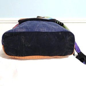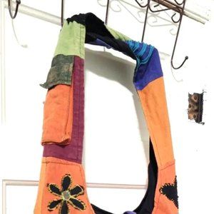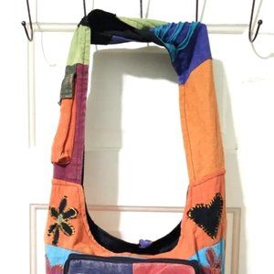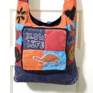 SUPER NICE VINTAGE Made in Nepal Unknown brand BOHO HIPPIE Multi Colored 100% Cotton Cloth Crossbody Hobo Shoulder Bag Purse, Geometric Pattern with "SLOW LIFE" Embroidered, Turtle - Flower - Peace - Heart Embroidered, Black Lining, Top Zipper Closure, Pocket on Crossbody, Front Zipper Pocket, Soft Rounded Rectangle Bottom and Inside Pockets.