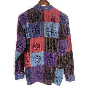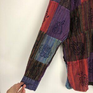 Nepal Patchwork Multicolor Chambray Long Sleeve Shirt Pocket Boho Oversized Sz M