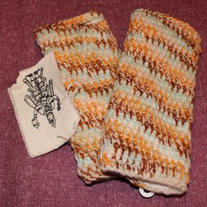 Hand-knit in Nepal, limited edition handwarmers in a brown/blue/orange multicolor pattern.